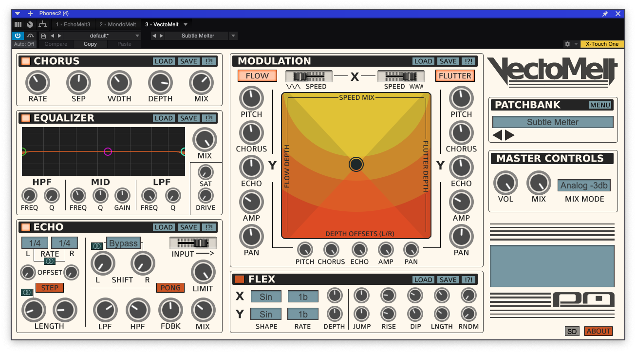 VectoMelt는 EchoMelt의 기능 강화 버전이다. EchoMelt보다 더욱 조작할 수 있는 기능들이 많아졌고, X-Y 패드가 추가되어 보다 자유도가 높아져서 EchoMelt보다 더욱 강력해진 성능을 가지고 있는 게 특징이다. EQ도 단순히 노브가 달려 있던 걸 넘어서 Q 값을 설정할 수 있고, 새츄레이션과 드라이브 노브가 나뉘어 있어 선택의 여지를 준 점도 마음에 든다. Echo 또한 L/R의 길이를 따로 줄 수 있게 바뀌었다는 점이 굉장히 마음에 든다. 기능이 많아진 만큼 처음 사용하게 된다면 무엇부터 만져야 할지 어려울 수 있기에 어떻게 VectorMelt를 사용해야 할지 감이 오지 않는다면 프리셋 기능을 적극적으로 활용해 보자.