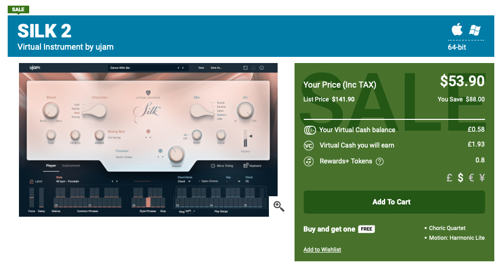 ujam SILK 2 구매 링크(PluginBoutique)를 클릭하거나, Plugin Boutique(링크)에 접속한 후, 검색창에 "ujam SILK 2"를 검색하면 위와 같은 화면이 나타난다. Plugin Boutique는 회원 가입을 하지 않아도 상품 구매가 가능하지만, 회원 가입을 하는 편이 추후 라이센스 관리에 용이하다. 기본값은 파운드화로 나타나지만 달러나 엔, 유로화로 가격을 바꿔가며 확인할 수 있다. 다만, 대한민국 원은 지원하지 않으므로 해외 결제가 지원되는 카드나 페이팔 계정을 미리 준비할 필요가 있다. Add to Cart를 클릭하여 상품을 내 장바구니로 담자.
