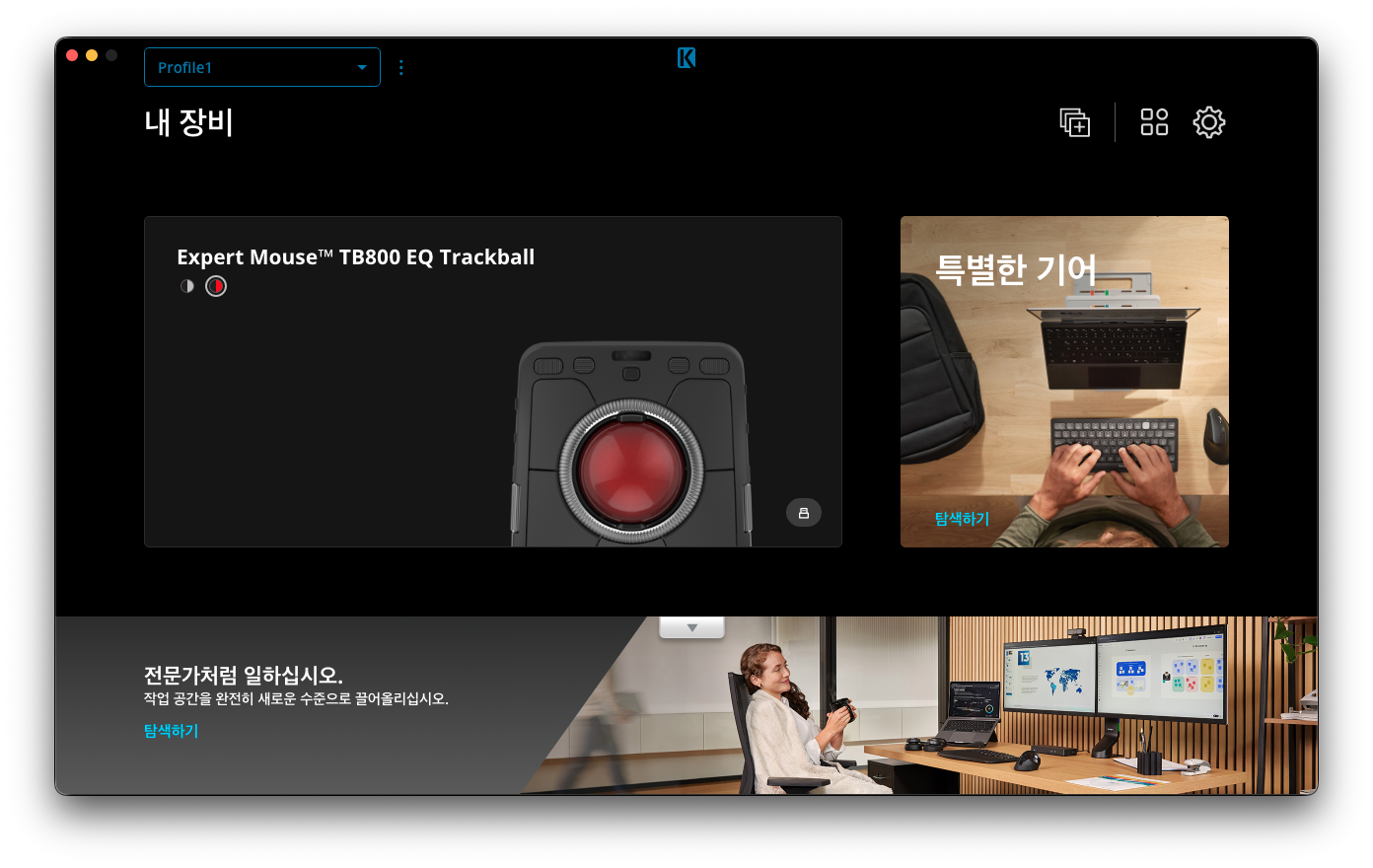 Kensington Konnect를 처음 실행하면 현재 연결되어 있는 장비 리스트가 나타난다. 현재 필자의 컴퓨터에는 TB800EQ만 연결되어 있기에 TB800EQ만 표시된다. 현재 어떤 프로토콜로 연결되어 있는지도 Kensington Konnect에서 확인할 수 있다.