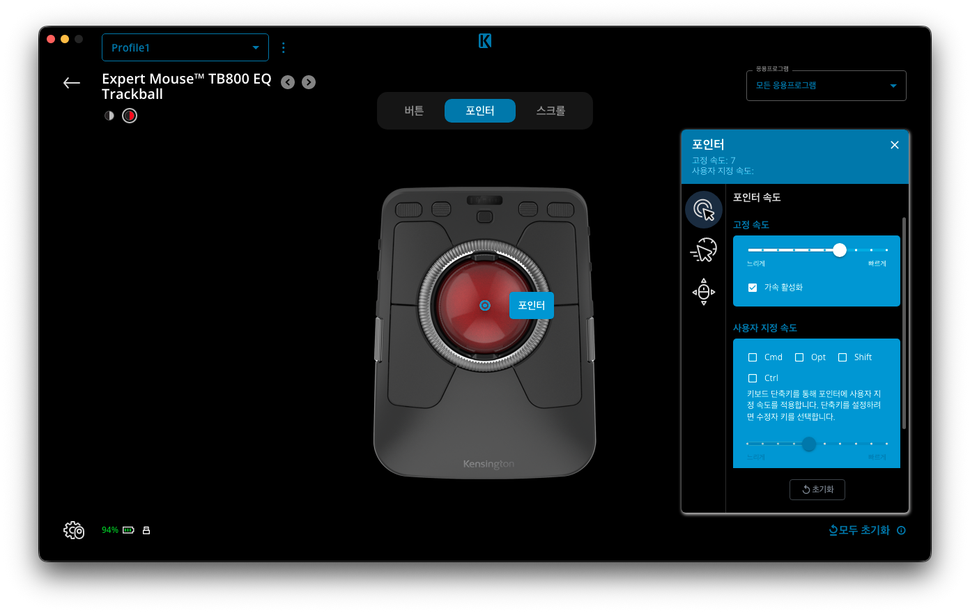 다음은 포인터 설정 창이다. 필자의 지론이지만 트랙볼 마우스는 빠른 이동보단 적당히 움직이면 된다는 생각이라 그렇게까지 빠르게 커서가 움직이게끔 설정하진 않았다. 다만 무조건 켜야 하는 옵션 하나가 있다면 바로 가속 활성화 옵션이다. macOS에서는 이게 없다면 굉장히 답답하게 느껴질 때가 많다. 전송 주기 및 DPI는 필자의 지론에 따라 1000Hz와 800으로 놓고 사용 중이다.