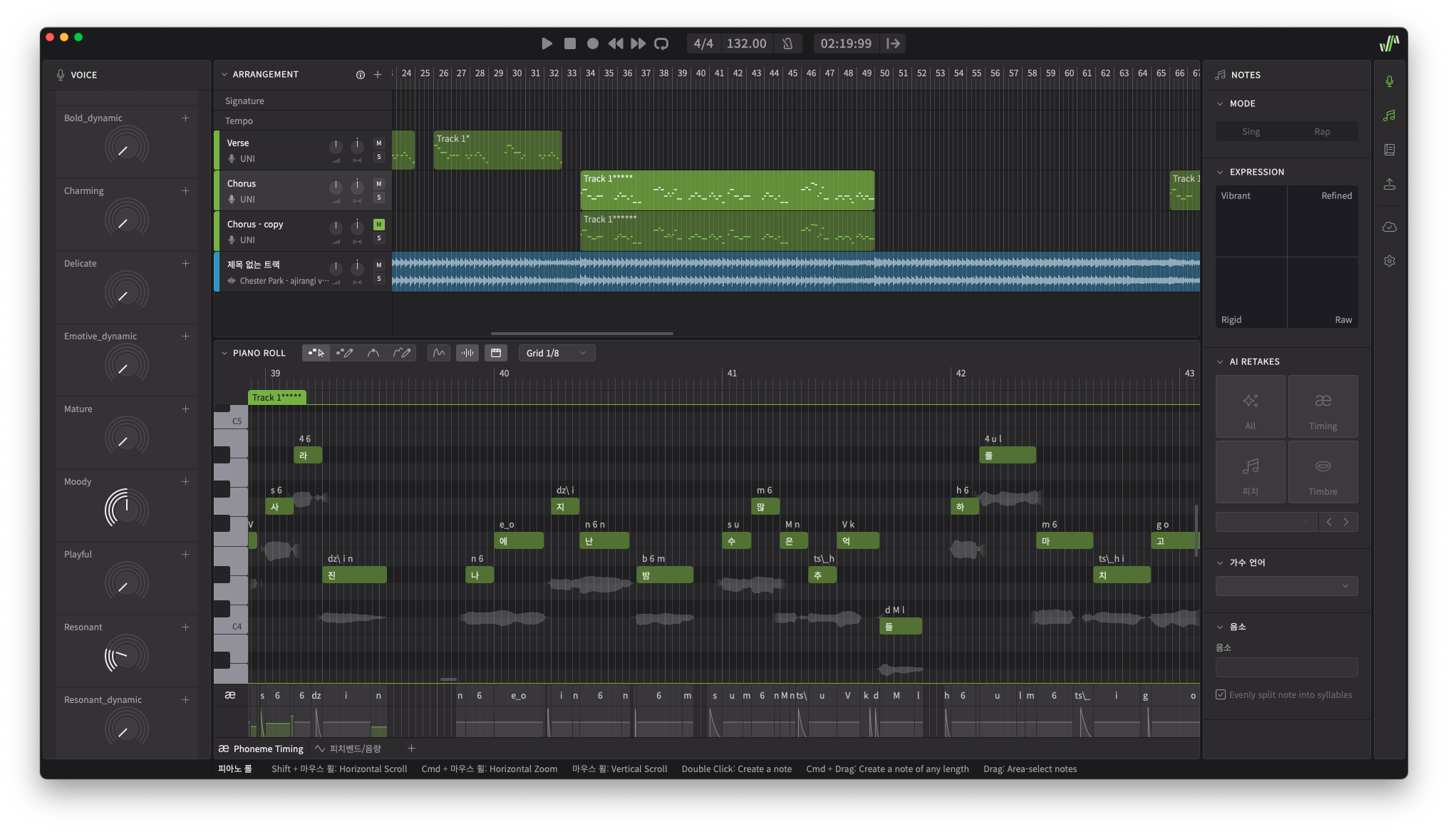 만일 개별 노트 단위의 디테일한 편집이 필요할 경우 Synthsizer V Studio 2의 Note 섹션을 이용하자. 타이밍과 음정, 음색 등을 AI를 이용하여 재조정해주는 AI Retake는 많은 파라미터 조작 없이도 원하는 결과를 빠르게 만들어낼 수 있어 굉장히 편리했다. 또한 보컬의 톤 및 비브라토, 보컬이 노래를 하는 것인지 랩을 하는 것인지 등 실제 사람이 부를 때 일어날 수 있는 모든 경우의 수들을 담아낸 Expression 패드 및 Song Mode를 이용하면 보다 사실적인 결과물을 얻을 수 있다. AI Retake는 계속해서 이전 값이 저장되기에 예전에 했었던 결과가 훨씬 마음에 들었을 경우 이전 결과를 적용할 수 있다.